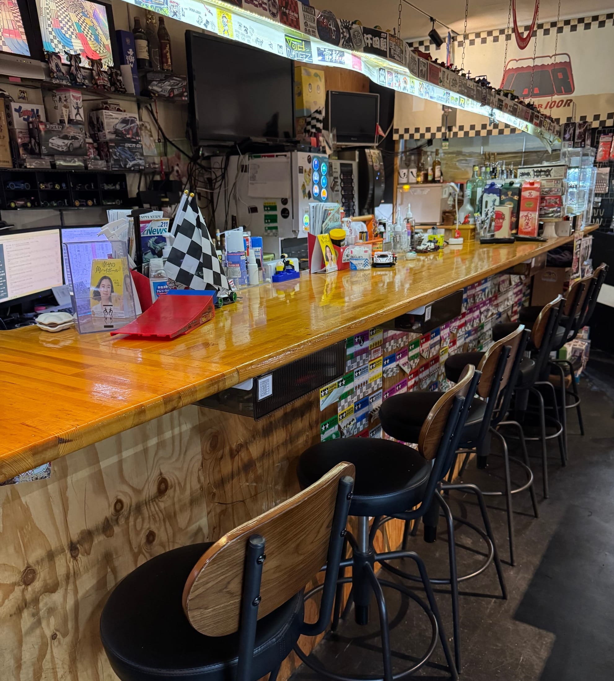 Nippombashi in Osaka draws visitors for anime, games, and hobby culture. Among the many shops in the area, one place offers something different. Racing BAR 100R combines Mini 4WD racing with a casual bar setting.