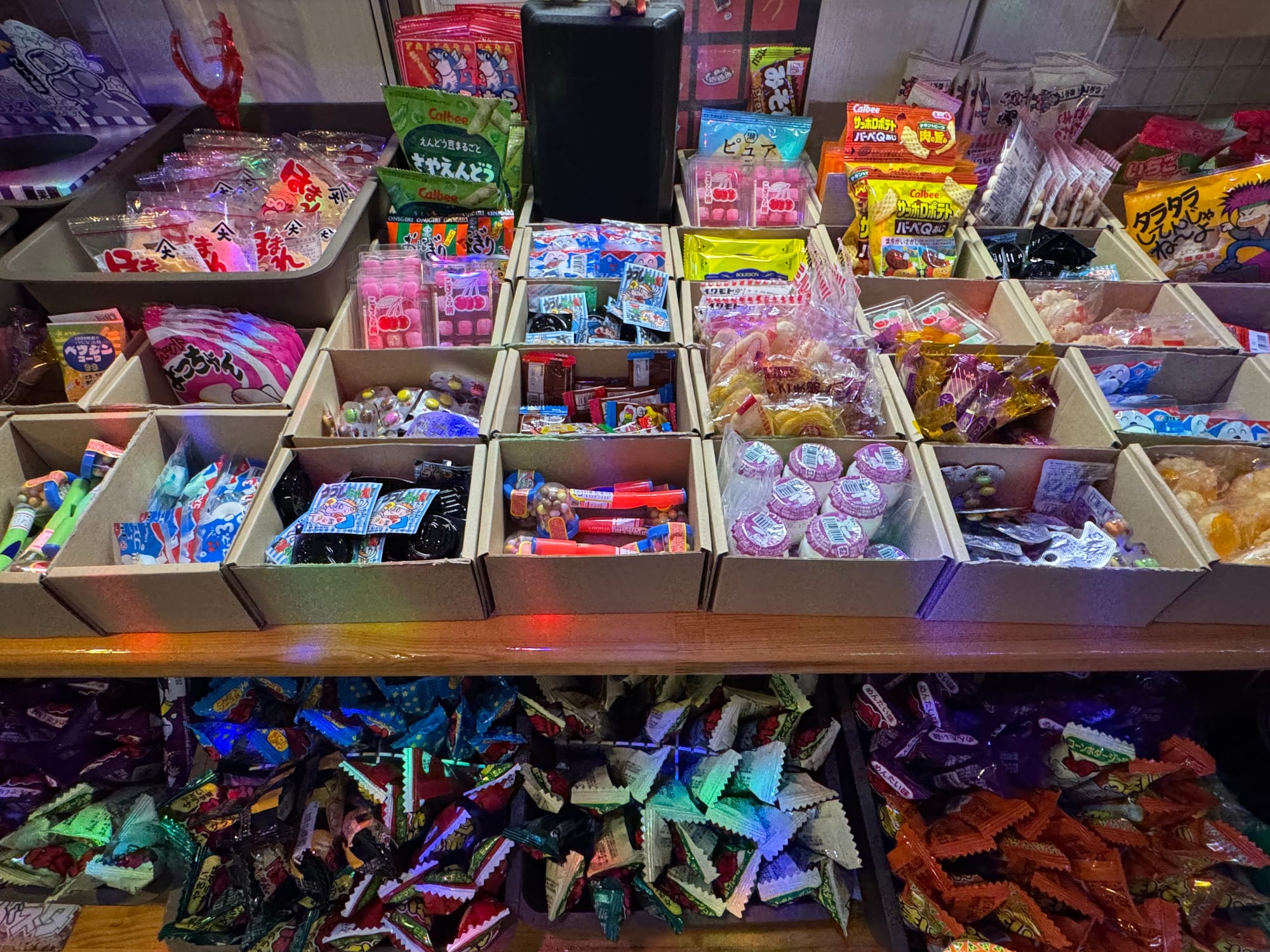 In the evening, shelves fill with dagashi snacks. Chocolate treats, ramune candy, chips, and other nostalgic items reflect a long-standing part of Japanese snack culture. Sharing snacks while watching races keeps the mood light and relaxed.